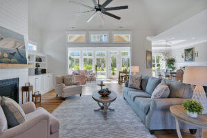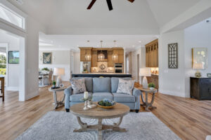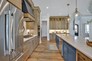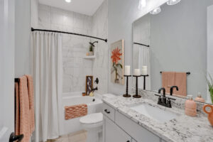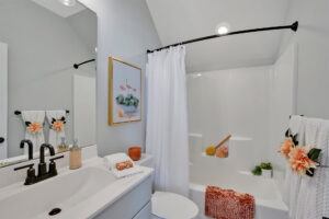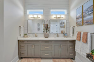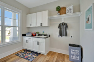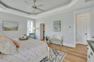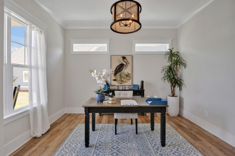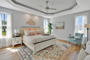 The master bedroom boasts a tray ceiling, his and hers closets, double vanities and a large corner or optional Roman walk-in shower. The first floor is completed by another bedroom, full bathroom, and an optional bedroom/study space.